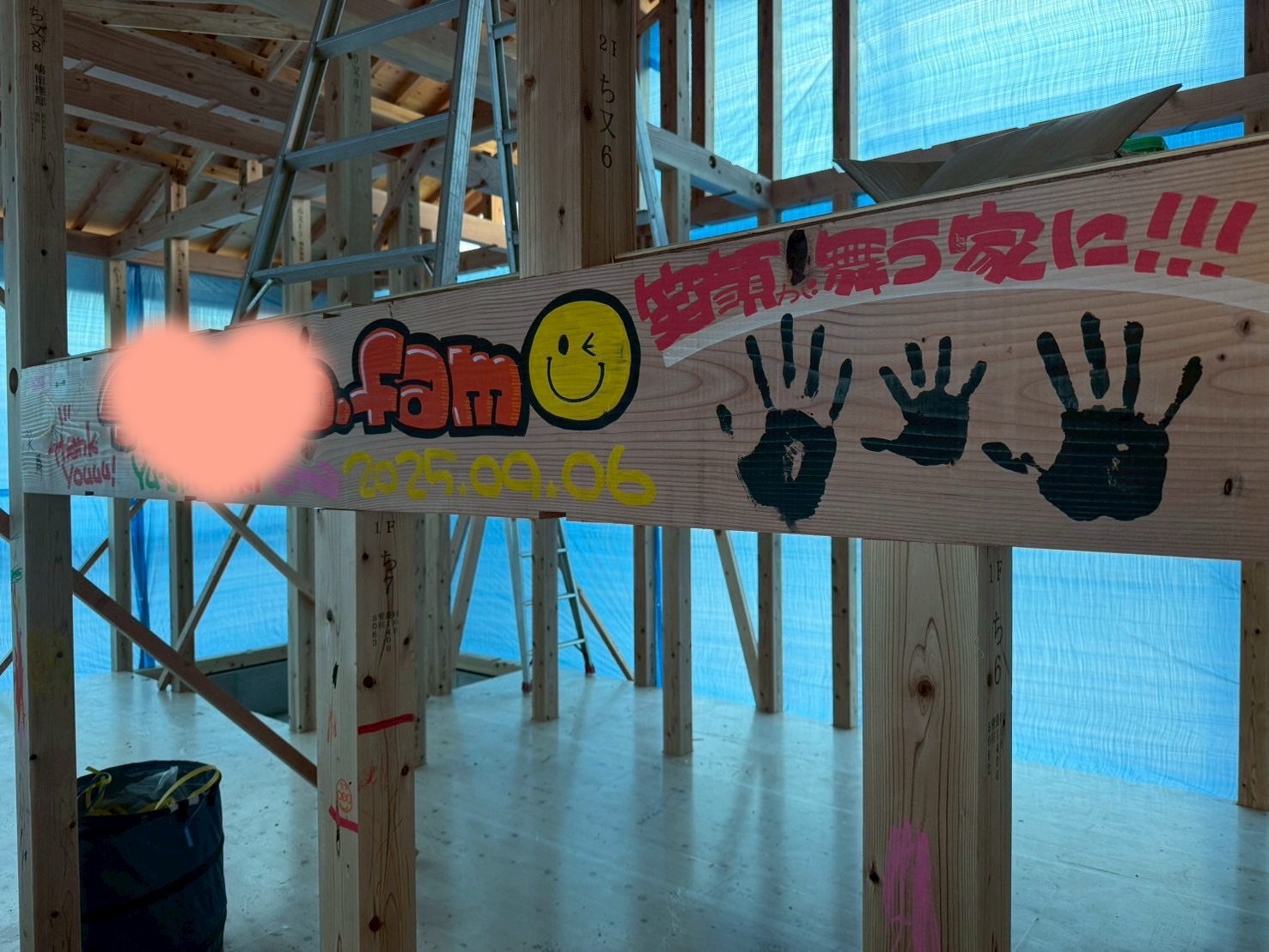 完成すると見えなくなってしまう梁ですが、家族3人の手形を押しました♡