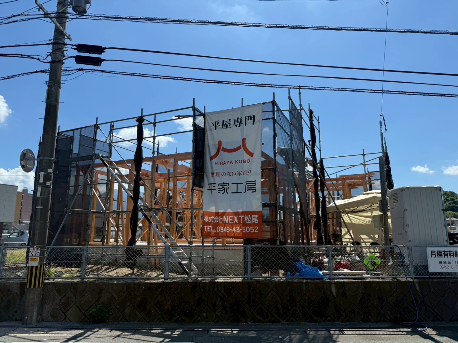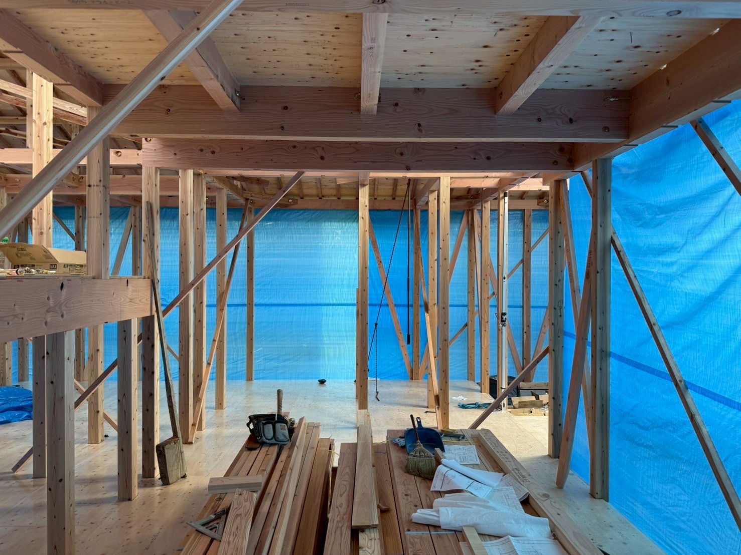 熟練の大工さんの手によって柱がどんどん立ち、梁や桁が渡り、きれいに組みあがっていきます。