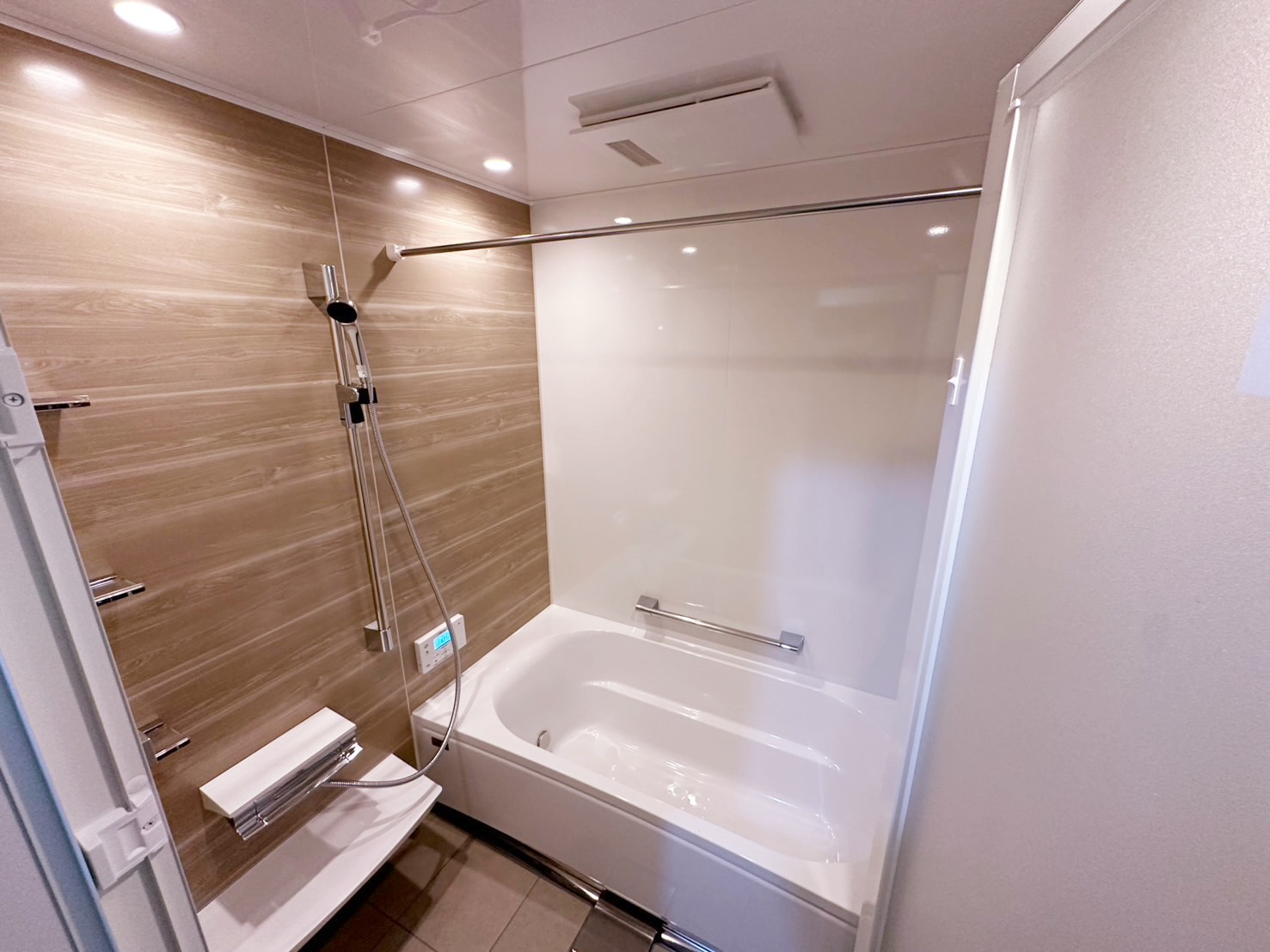 浴室パネル(正面)のアクセントカラーはグレージュアッシュにして高級感且つ清潔感のある空間に仕上げました。