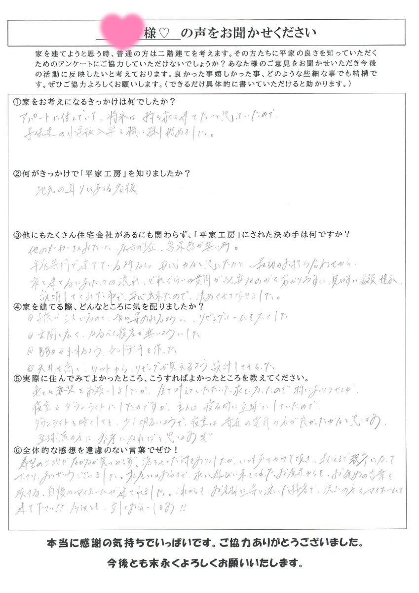 平家専門で建てている所なら安心かなと思ったのと、最初のお打ち合わせから、家を建てるにあたっての流れ、どれくらいの費用が必要なのかを分かりやすい、見やすい金額提示、説明してくれた事で、安心出来たので決めさせていただきました。