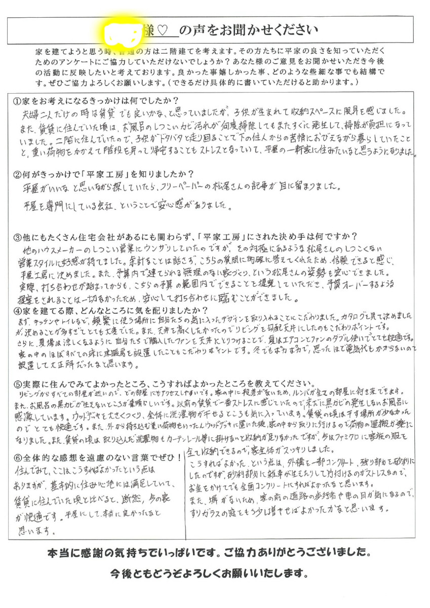 他のハウスメーカーのしつこい営業にうんざりしていたのですが、その対極にあるような松尾さんのしつこくない営業スタイルに好感が持てました。